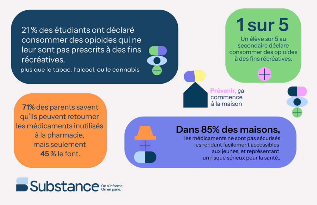 Certes le retour en classe est une période excitante mais elle s’avère aussi une source de stress et d’anxiété pour plusieurs jeunes.  Certains peuvent être incités à consommer des substances comme mécanisme d’adaptation.  Prévenir, ça commence à la maison cible de front cet enjeu en sensibilisant à l’importance de limiter l’accès aux médicaments d’ordonnance en encourageant les familles à entreposer leurs médicaments de façon sécuritaire et à retourner ceux périmés ou non-utilisés à la pharmacie.